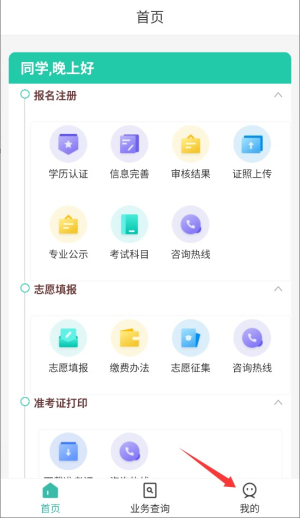 1、在主页面选择"我的"功能入口,进入个人管理与服务界面。