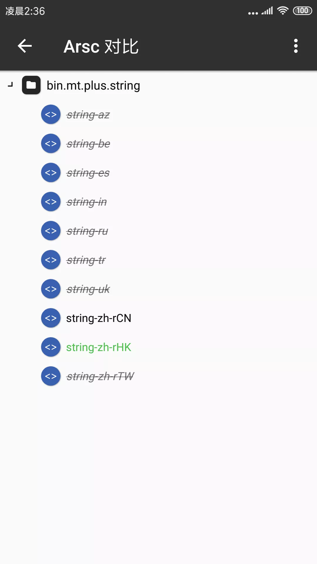 选中两个 APK 文件或者两个 ARSC 文件长按即可进行 ARSC 对比。