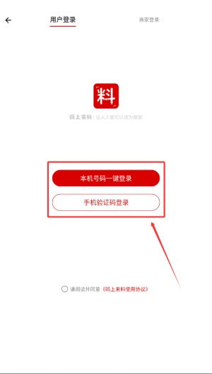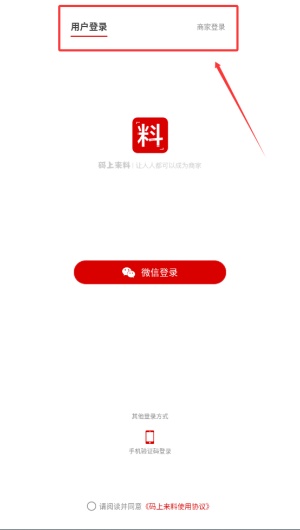 2、登录前需选择身份,可点击“用户登录”或“商家登录”进入对应通道。