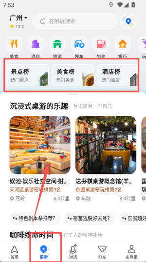 3、点击底部 “探索” 标签,页面会展示景点榜、美食榜等榜单,下方推荐当地的休闲娱乐场所。
