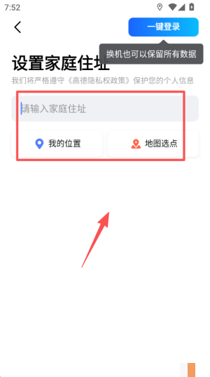 1、在首页找到 “设置家” 选项,点击后进入设置家庭住址页面,可输入地址或选择 “我的位置”“地图选点”。