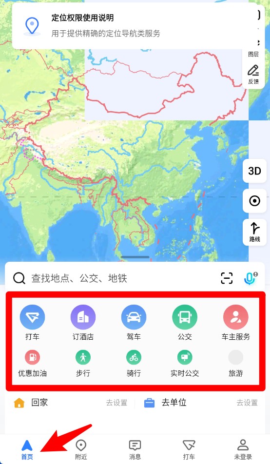 2、回到搜索界面,能看到 “回家”“上班” 选项,可分别设置家庭与公司的地址信息,方便后续使用。