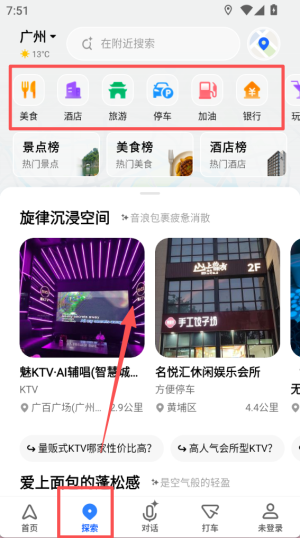 3、点击底部 “探索” 标签,页面顶部有美食、酒店等分类,下方展示当地休闲娱乐场所的推荐内容。