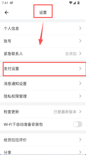 4、进入设置界面,找到 “支付设置” 选项,点击进入后可配置与订单支付相关的各类信息与偏好。