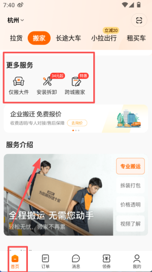 2、在首页 “更多服务” 板块,能看到仅搬大件、安装拆卸等选项,可按需选择对应的搬家配套服务内容。
