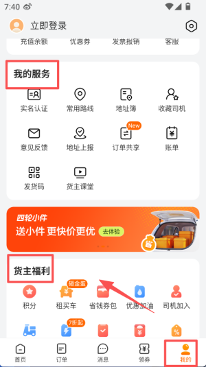 3、切换到 “我的” 页面,“我的服务” 板块包含实名认证等功能,“货主福利” 区可使用积分、省钱券包等权益。