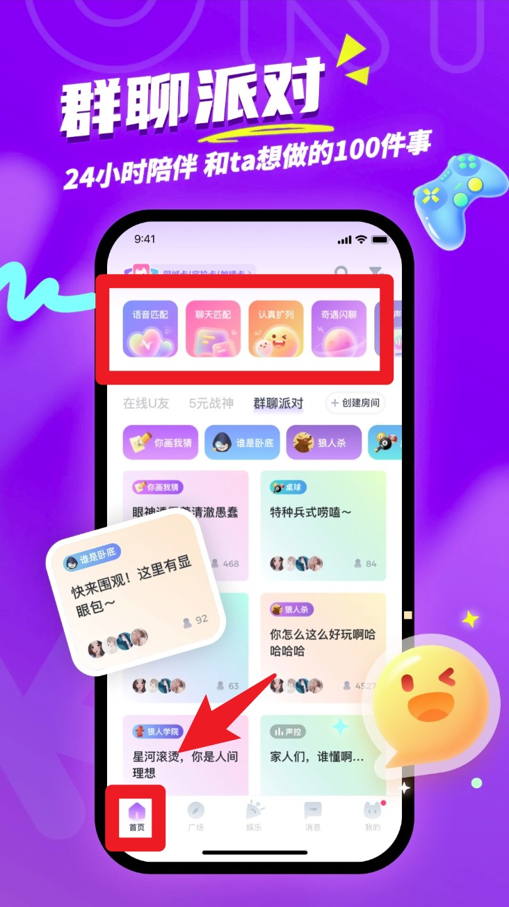 2. 登录成功后默认进入首页「群聊派对」页面,可以从上方选单切换语音匹配、聊天匹配、扩列频道等功能,点击即可进入对应玩法。