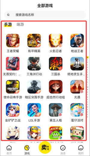3、在游戏列表中浏览或搜索,选择您需要购买账号的特定游戏类型与分区。