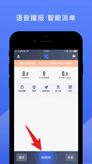 2、登录后点击“听单中”即可开始接单,平台将自动为您推送附近订单。