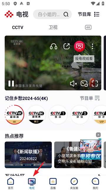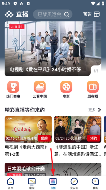 1、下载安装央视频app,然后打开软件,能看到底部的直播栏目,点击前往即可看到最新最热门的直播节目