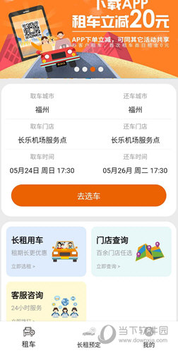 1、打开天下行租车APP,在”租车“的功能界面中填写取车城市取车门店和取车时间之后点击”去选车“。
