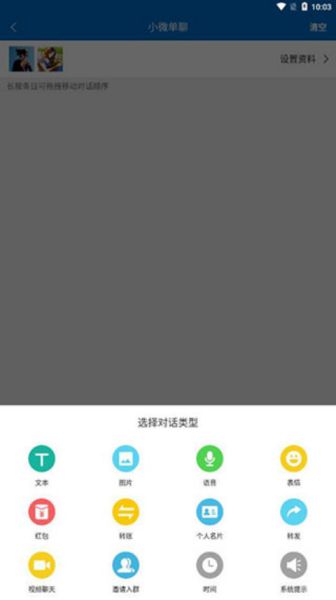 8、可选的对话类型有很多,比如文本、图片、语音、表情、红包、转账等等,模拟真实的聊天对话;
