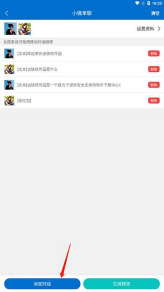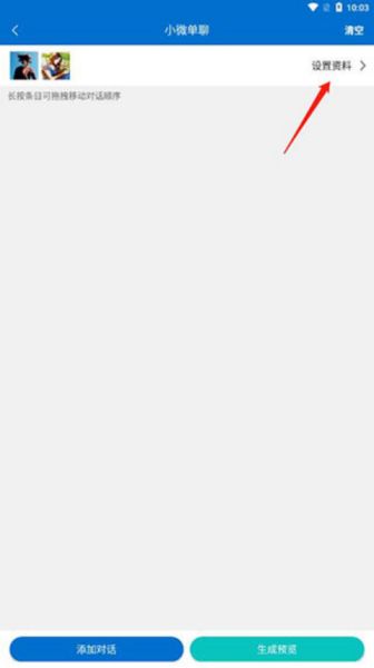 5、使用对话生成器截图神器app最常用的就是对话截图,方法很简单,点击小微单聊,可以看到两个微信,点击设置资料可以为其设置信息;