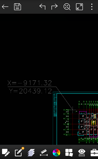 然后在图纸点击需要标注的位置,这个时候单指长按屏幕,可以弹出捕捉框,这样就可以根据捕捉点精确选择需要标注的位置。下方会显示对应的坐标点数字,如果确定坐标点正确,那么在需要标注坐标文字的地方点击一下,就会生成坐标标注。