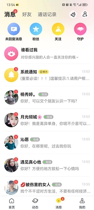 用户点击屏幕下方的消息,可以进入到消息界面,界面内有未回复消息、粉丝、守护、关注四个功能。也可以查看好友消息,以及通话记录。