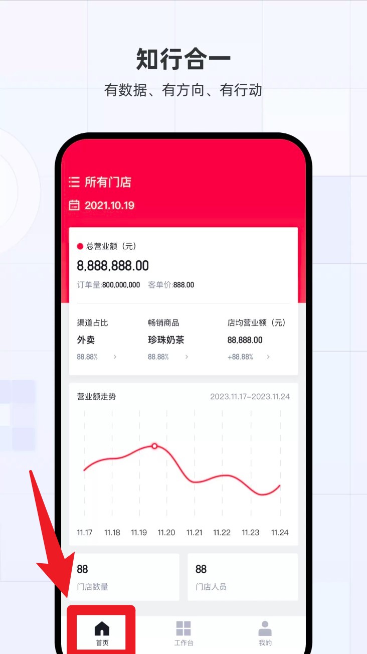 2. 登录成功后默认进入「首页」,可查看门店营业额、订单量与经营数据趋势图。