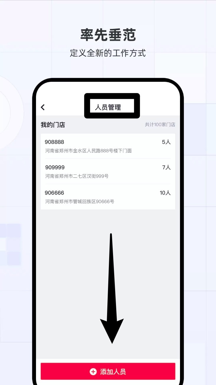 4. 在「人员管理」中选择具体门店,点击底部「添加人员」即可进行人员账号配置。