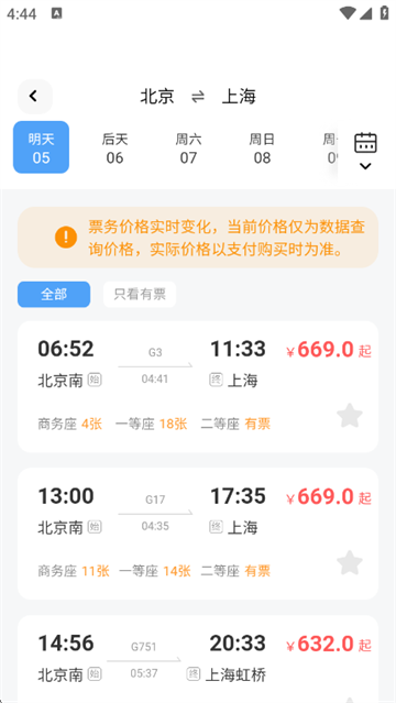 3、专注于高铁票务查询服务,可支持多日期、多线路(例如北京至上海)的车次、票价及座位信息查询,以此满足用户在高铁出行过程中的票务信息获取需求。