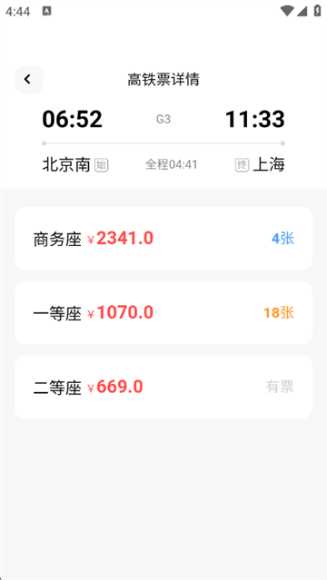 3、配备高铁票详情查询功能,呈现各座席的余票情况,便于用户在购票前充分掌握票务状态。
