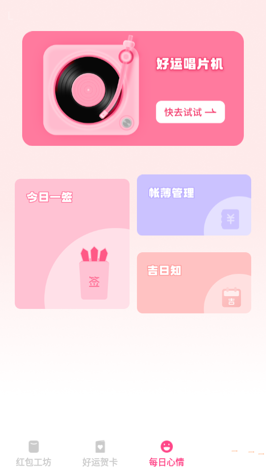1、每日心情:可记录生活点滴,“好运唱片机”提供多种背景音乐选择,为作品增添氛围。