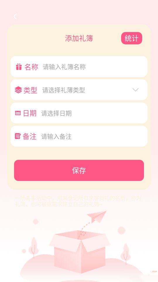 4、然后进入“添加礼簿”菜单界面, 输入名称、类型、日期、备注后点击“保存”按钮就完成了