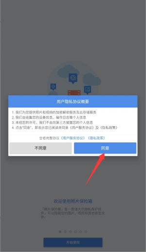 1、首次启动应用时,系统会显示用户协议和隐私政策,阅读后点击同意按钮进入主界面。