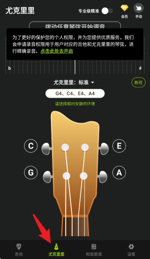 3.切换至尤克里里模式,可按标准音对四根琴弦进行调音,适配多种使用场景需求。