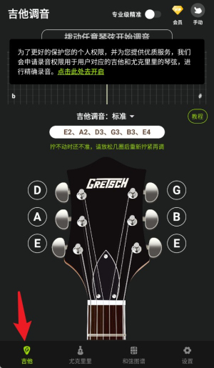 1.进入吉他调音界面,根据标准音提示逐一校准六根弦,操作直观方便适合新手使用。