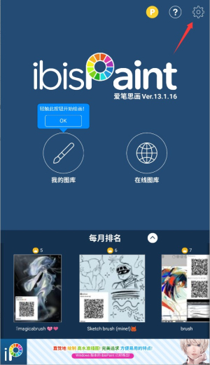 2、进入绘画主界面后,在右上角找到并点击齿轮状“设置”图标。