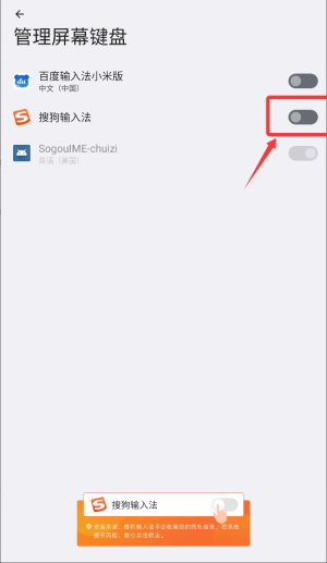 2、随后进入键盘管理页面,在可用输入法列表中选择并启用搜狗输入法。