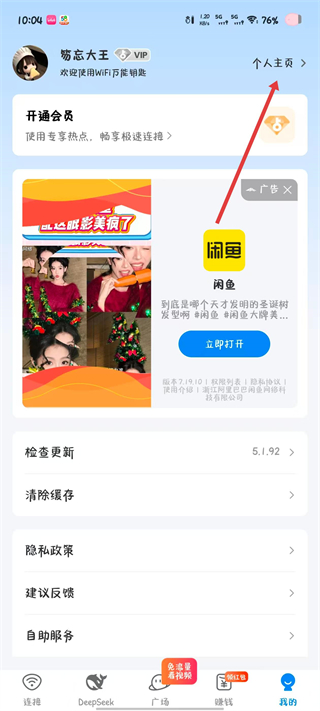 1、打开WiFi万能钥匙进入我的页面,找到个人主页选项并点击进入对应界面。