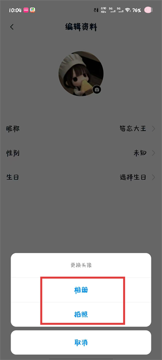 3、在编辑资料界面找到头像区域的相机图标,点击图标弹出更换头像的选项。