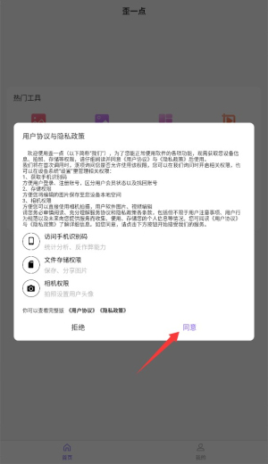 1、首次启动应用时,系统会显示用户协议和隐私政策,阅读后点击同意按钮进入主界面。