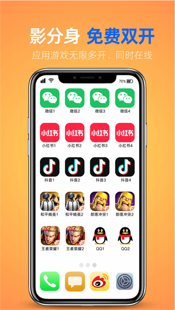 应用分身软件稳定不掉线,一部手机实现应用多开不限个数、分身多开!轻松解决微信双开、游戏账号多开、小红书多开、QQ多开、淘宝分身、美团多开等应用分身多开!分身软件添加到桌面,一机多开私密空间,UI查看调试功能,机型模拟功能,稳定更可靠!