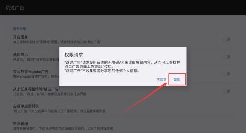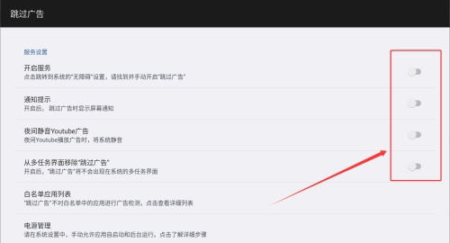 请把“跳过广告”应用加入电源管理白名单,允许“跳过广告”自动启动和后台运行。否则应用无法正常工作。