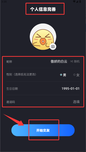 3、完善个人资料填写昵称与性别等信息,开启交友功能。