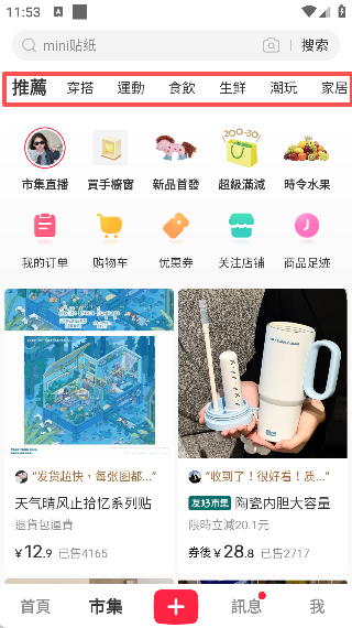 2.打开市集可以看见有更多“穿搭、运动、食饮、生鲜、潮玩和家居等等”;