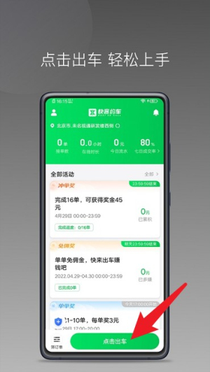 1、点击首页底部“点击出车”按钮即可开始接单任务。