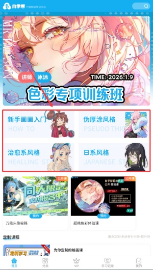 自学帮app是一款在线绘画学习平台,丰富课程知识点内容随时在线学习,专业导师线上教学,新手入门教学让你不断掌握绘画重点,了解更多绘画技巧,从而来不断提升学习能力,有需要的快来下载吧!