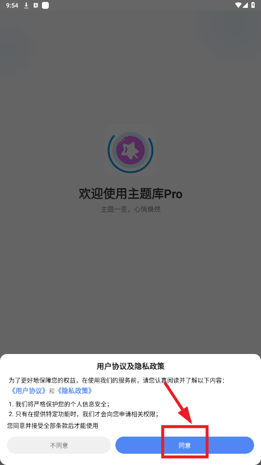 打开主题库pro,点击同意相关协议