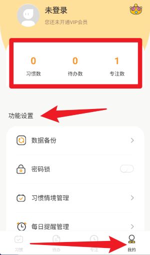 5、点击底部“我的”进入个人中心,可查看习惯数、待办数和专注数,并进行数据备份、密码锁设置及提醒管理。