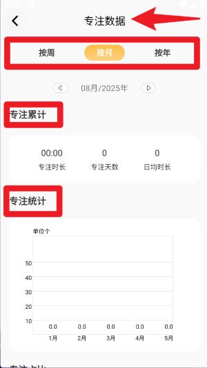 4、在“专注数据”页面,可以按照周、月、年查看累计专注时长与统计数据,便于分析和调整专注习惯。