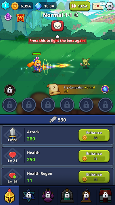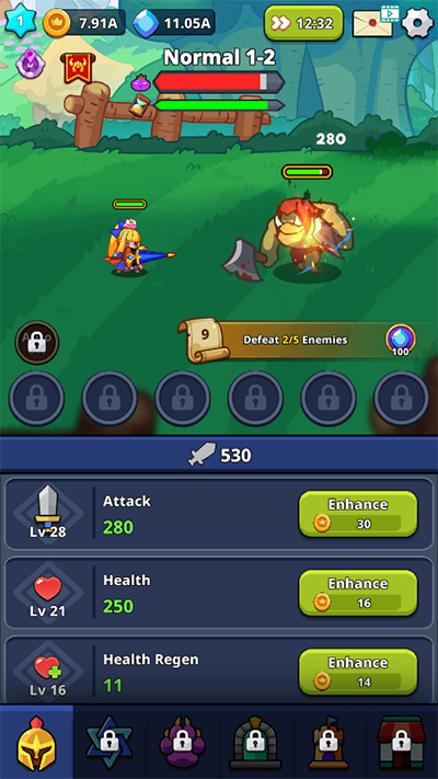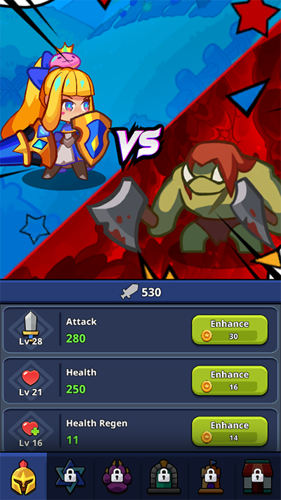 1、首先,在本站下载安装该游戏的最新版;一旦安装完成,打开游戏并开始你的冒险之旅;游戏会自动挂机,这意味着你不需要手动操作角色,只需点击下方的绿色按钮即可使用金币来提升角色的攻击力;通过不断升级攻击力,你将能够更轻松地击败各种强大的怪物;