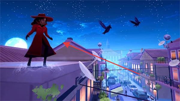 3、屋顶场景里,按箭头指引方向(如指向建筑)移动,推进角色行动。