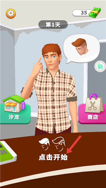 1、主界面点“点击开始”,进入为顾客理发的操作场景。