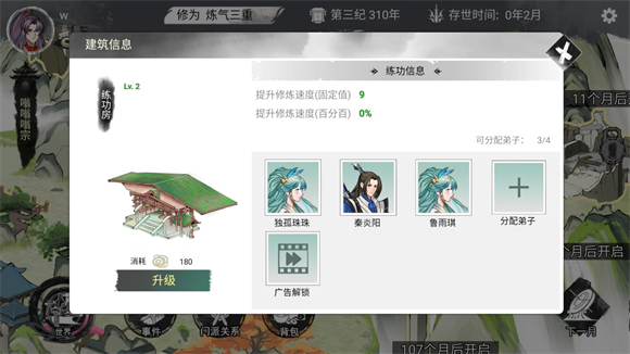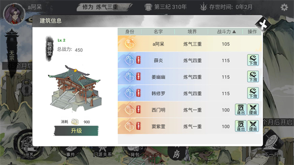 4、消耗金币可以升级建筑的等级,提升等级能分配更多的弟子工作。