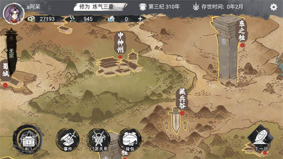 7、点击世界可以探索不同的地点,地图里会随机出现不同的事件,派遣弟子完成事件可以获得奖励。