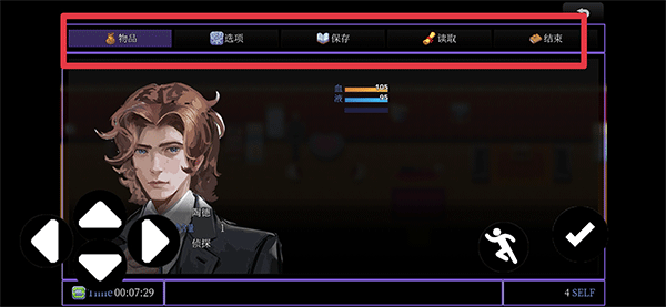 4、点击menu按钮、可查看物品、存档读档及结束游戏。