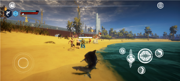 8、向上向下滑动“跃出水面”的按钮,可以控制鲨鱼游行的高度,浮出水面或潜入海底,在水面上使用时,可以触发跃出水面。这里有个需要注意的点,注意鱼鳃的脱水情况,在血条上方的进度条即将消失时,意味着鱼鳃即将脱水,需要立即从陆面返回水中。