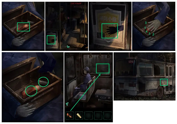 2、点击高跟鞋会被女纸人用手阻拦,根据提示牌上的顺序提示,按顺序点击女纸人的手指,拿到【高跟鞋】和【蜡烛】。用【高跟鞋】敲碎车窗,逃出公交车后点击应急控制开关,打开车门。